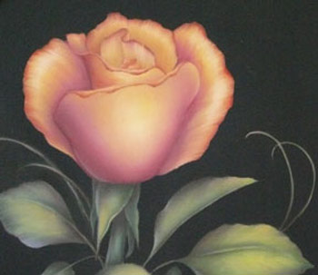 Description: A beautiful but simple design utilizing the application of glazed color to achieve the glow of this rose. The ground is Delta Blue Velvet. The surface is a cake plate that is set on feet and has a glass insert that goes over the design. Design was printed in the Decorative Painter in 2009 and is now in the Permanent Collection of the Society of Decorative Painters.