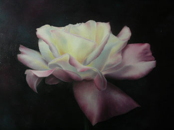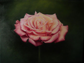 Description: Double Delight rose with pink to cream hues on dark ground. Oil on 12x16 Gallery stretched canvas.