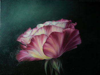 Description: Light is held at the base of a couple of petals that are surrounded by dramatic colors of pink, magenta, peach and yellow - set against a portrait painted dark ground - the technique follows more of a stroke interpretation of realism. 12x16 on Portrait Canvas.